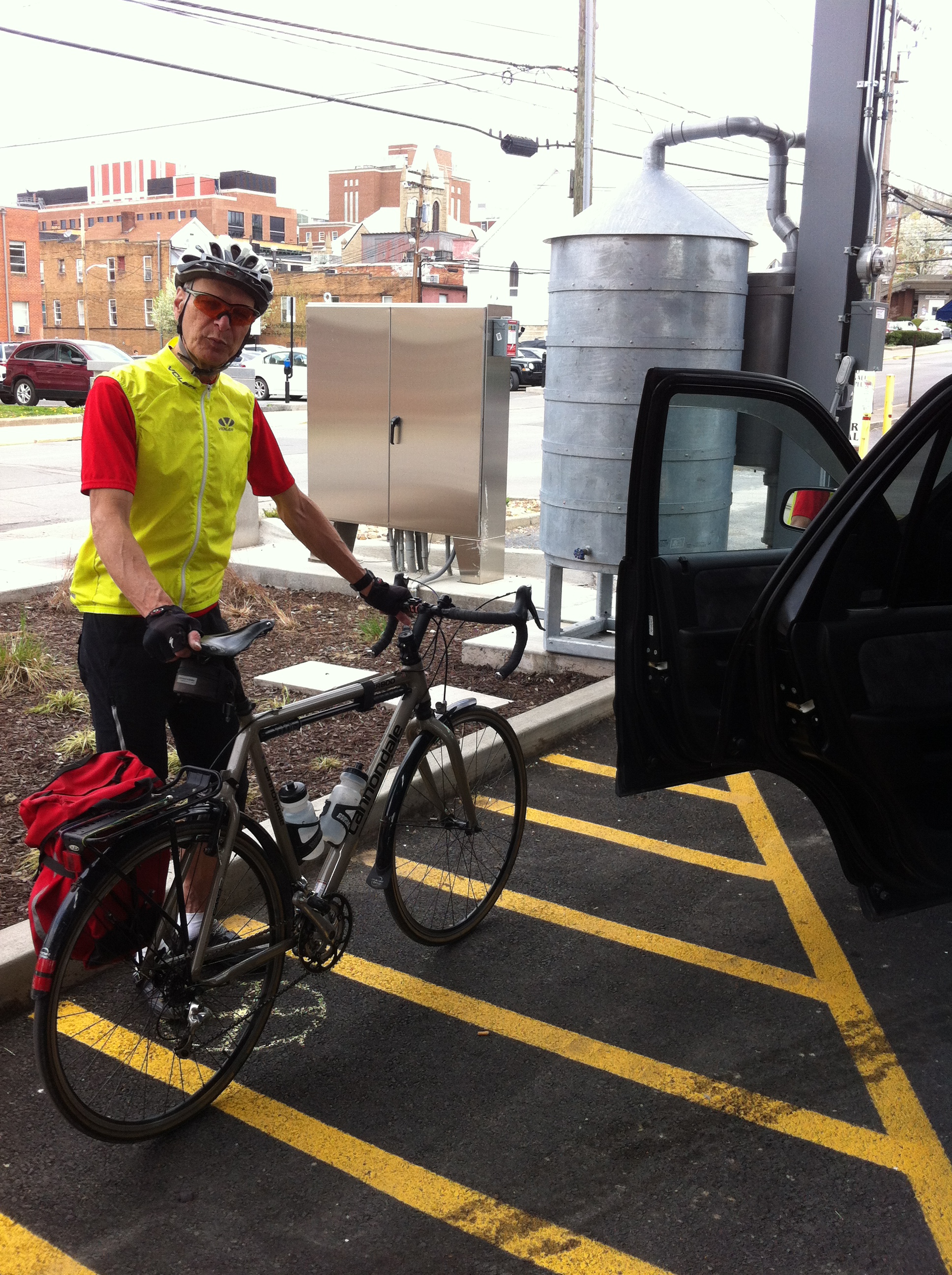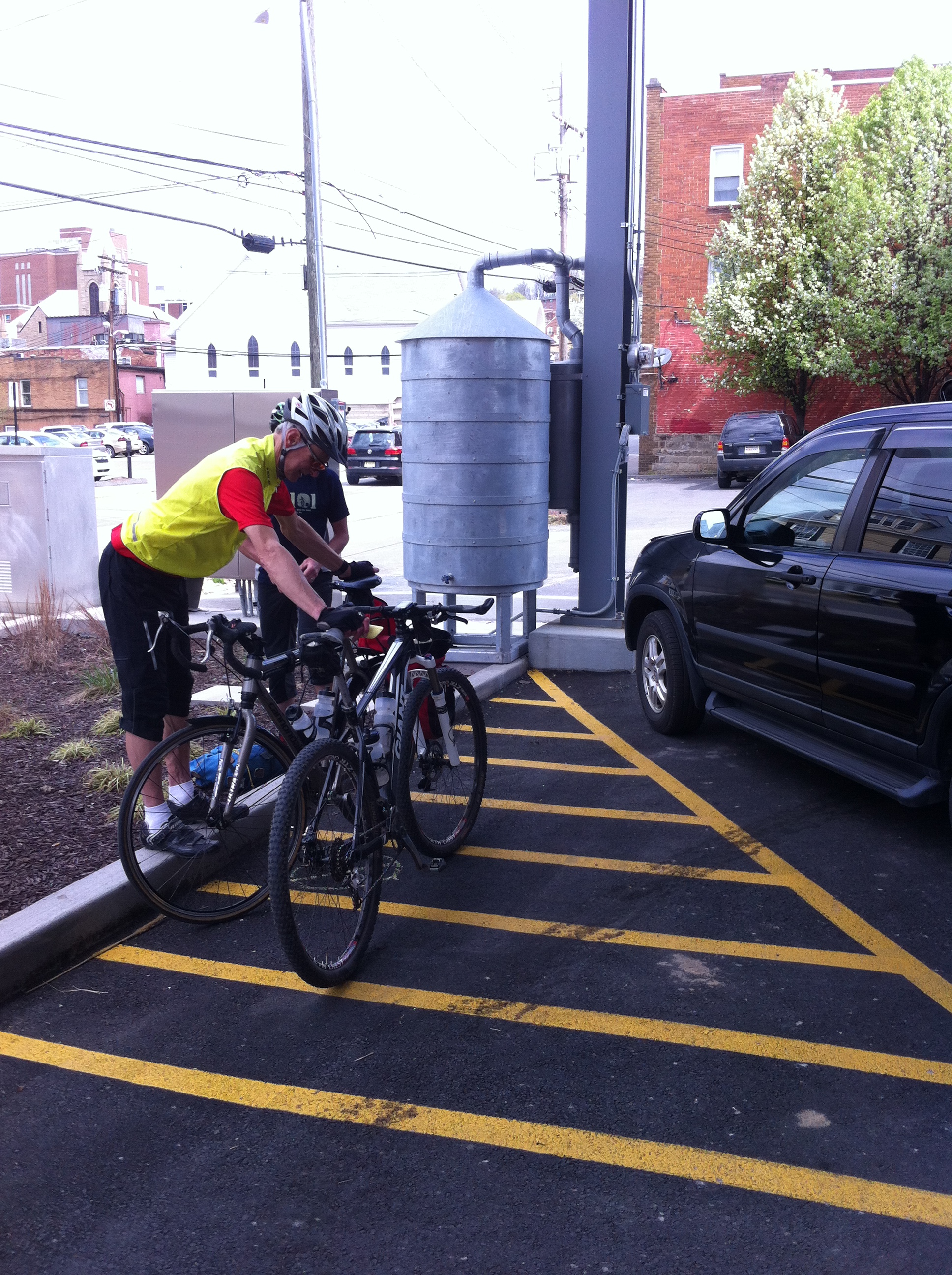 Another alternative might be to make the post and loops removable. That way they could be taken out for the Farmer's Market and then put back in afterward. Attached are the photos that I took. I have a video of Linda pulling her SUV in next to the bikes but it is too large to email.