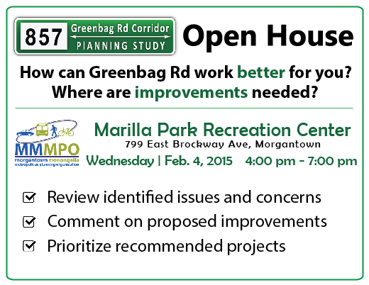 The Morgantown Monongalia MPO is to hold a public open house for Greenbag Rd Corridor Planning Study.