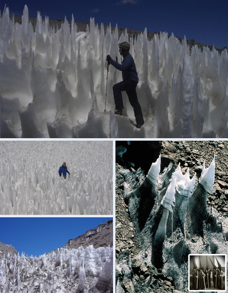 Named after peak-hooded New Mexican monks (lower right above), penitentes are dazzling naturally-forming ice blades that stick up at sharp angles toward the sun.