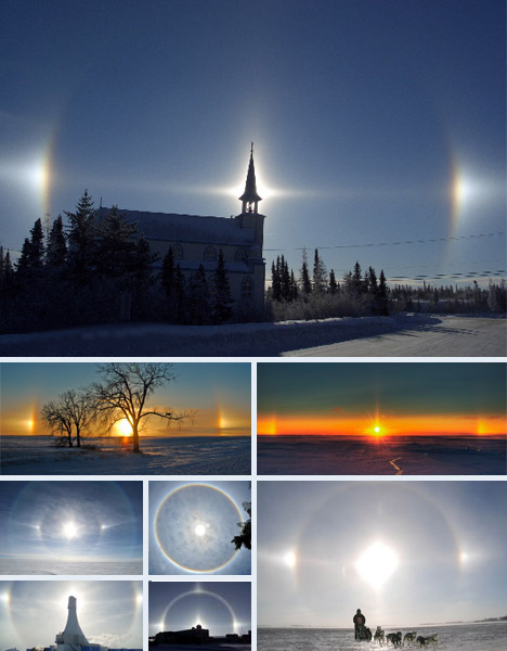 These are visible when light reflects just right off of ice crystals from either the sun (as in the two top images above) or from artificial ground sources such as street or park lights.