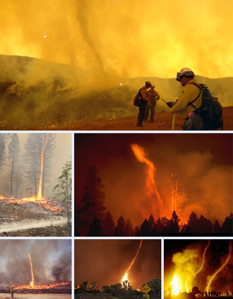 Fire whirls (also known as fire devils or tornadoes) appear in or around raging fires when the right combination of climactic conditions is present.