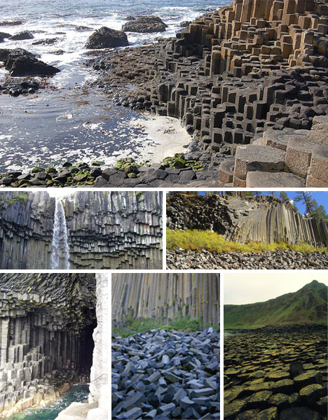 When a thick lava flow cools, it contracts vertically but cracks perpendicular to its directional flow with remarkable geometric regularity - in most cases forming a regular grid of remarkable hexagonal extrusions that almost appear to be made by man.