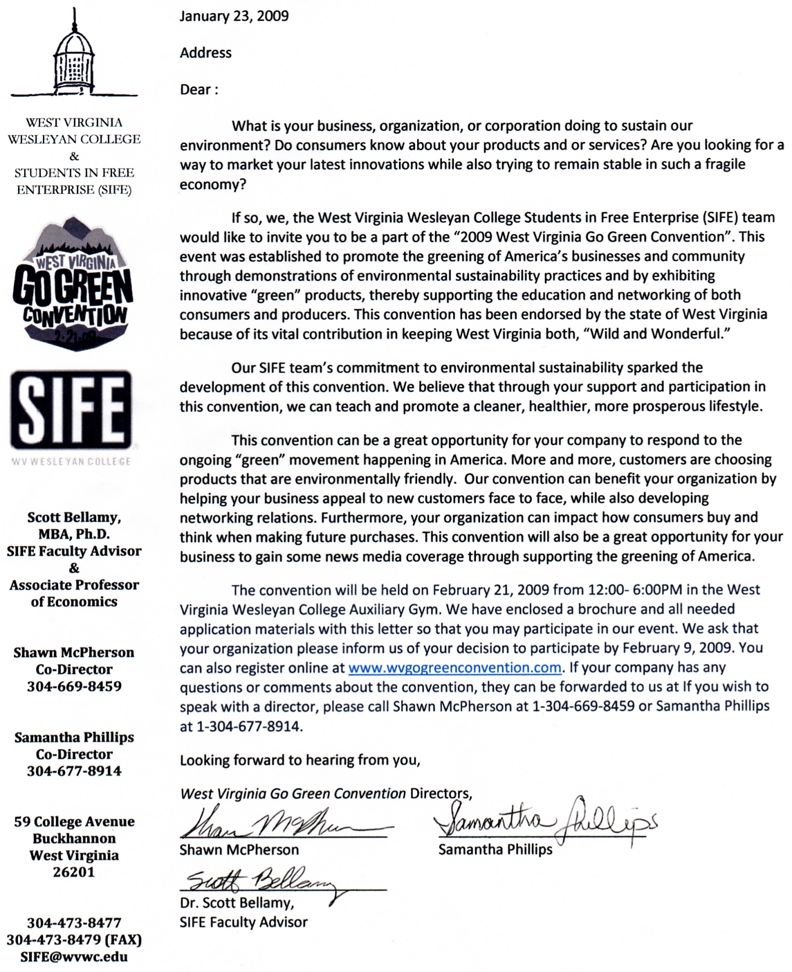 The convention will be held on February 21, 2009 from 12:00- 6:00PM in the West Virginia Wesleyan College Auxiliary Gym. We have enclosed a brochure and all needed application materials with this letter so that you may participate in our event. We ask that your organization please inform us of your decision to participate by February 9, 2009. You can also register online at www.wvgogreenconvention.com. If your company has any questions or comments about the coWenvention, or if you wish to speak with a director, please call Shawn McPherson at 1-304-669-8459 or Samantha Phillips at 1-304-677-8914.