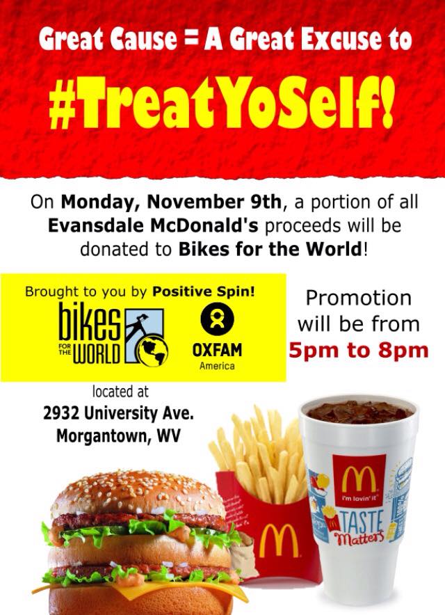 Hey everybody! Positive Spin and Oxfam America @ WVU are hosting a fundraiser this Monday at Evansdale McDonald's to raise money for Positive Spin's Bikes for the World http://bikesfortheworld.org project! The fundraiser (Phase II) is only for a short period of time between 5-8pm in which we are challenged to raise McDonald's sales by 5%; if everyone reading this announcement stops by that will happen!